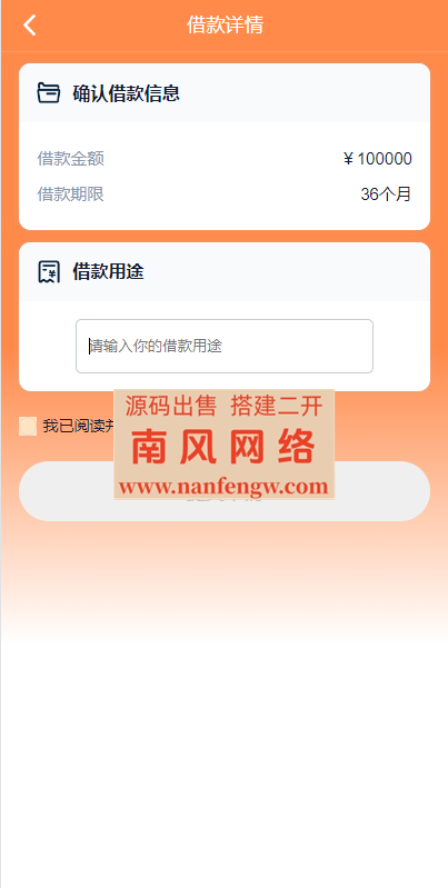 当前位置:首页精品资源 正文 vue版贷款系统/海外贷款源码/小额贷款源码一套比较经典的贷款源码, 后台 代理 前端均为vue源码,前端有中文和越南语前端ui黄色大气,逻辑操作简单,注册可对接国际短信,可不对接用户注册进去填写资料,后台审批,审批状态可自定义修改文字显示免责声明:1.本站提供的一切源码、教程和内容信息仅限用于学习和研究目的;不得将上述内容用于商业或者非法用途! 2.本站信息来自网络收集整理,版权争议与本站无关。您必须在下载后的24个小时之内,从您的电脑或手机中彻底删除上述内容! 3.本站提供的源码,模板,插件等其他资源都不包含技术服务,敬请谅解! 4.本站资源售价只是赞助,收取费用仅维持本站日常运营所需! 5.本站不保证所提供下载的资源准确性安全性和完整性,源码仅供下载学习之用! 6.如用于商业或者非法用途,与本站无关。一切后果请自行负责! 标签:贷超系统贷款超市贷款