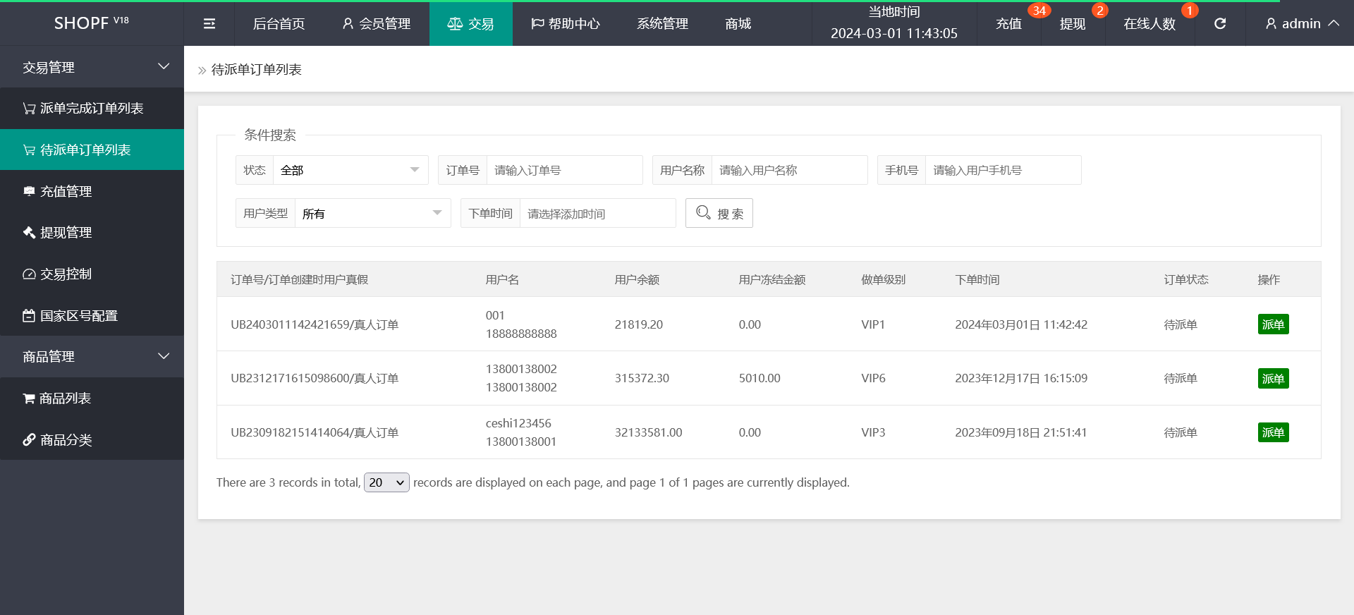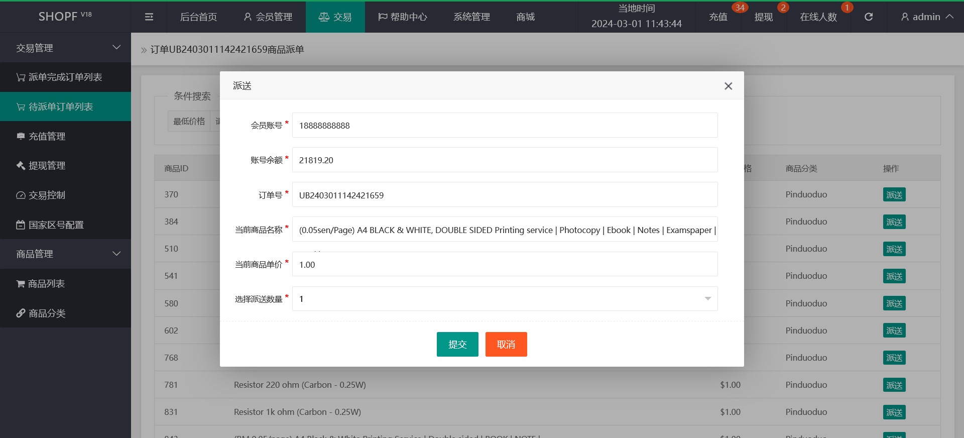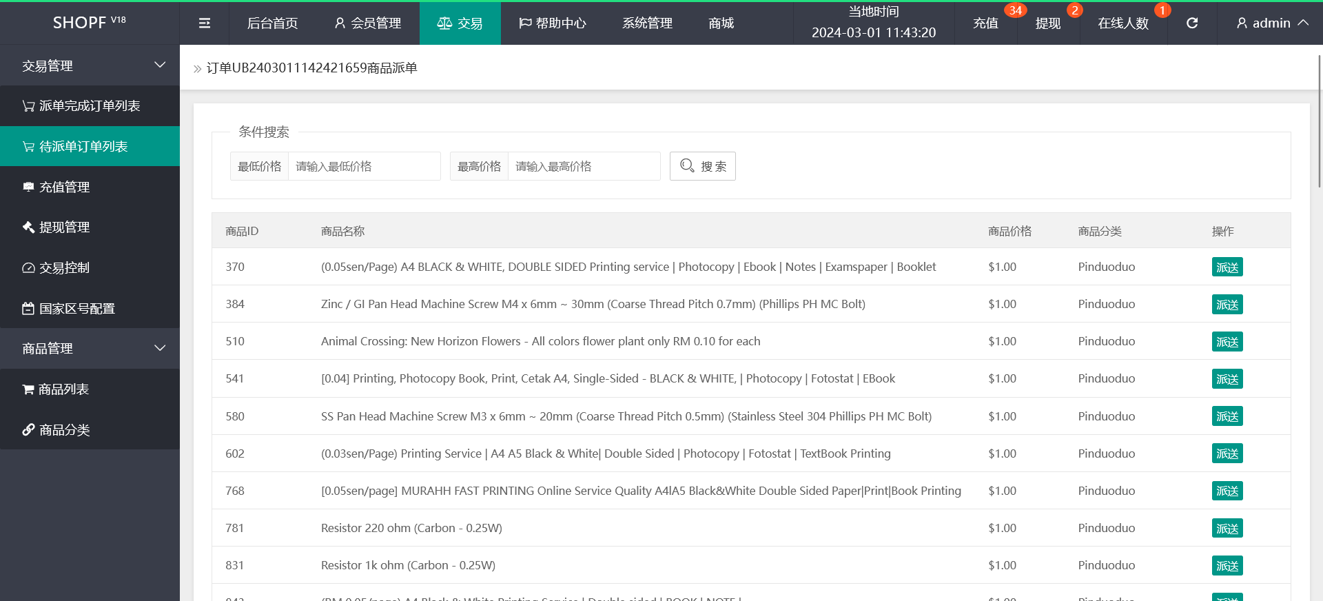 手动派单模式:客户抢一单 后台派一单 可自由设置派单商品单价 数量